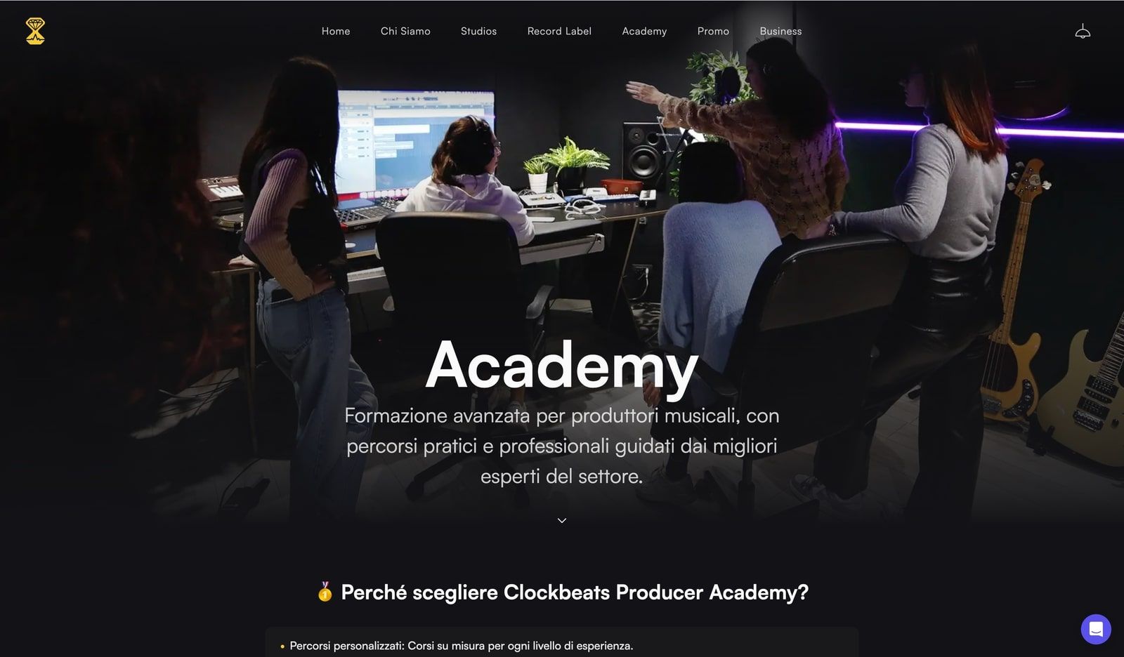 I corsi sono personalizzati a ogni livello, dai principianti ai professionisti, con lezioni pratiche e uso diretto degli studi Clockbeats con attrezzature all’avanguardia.