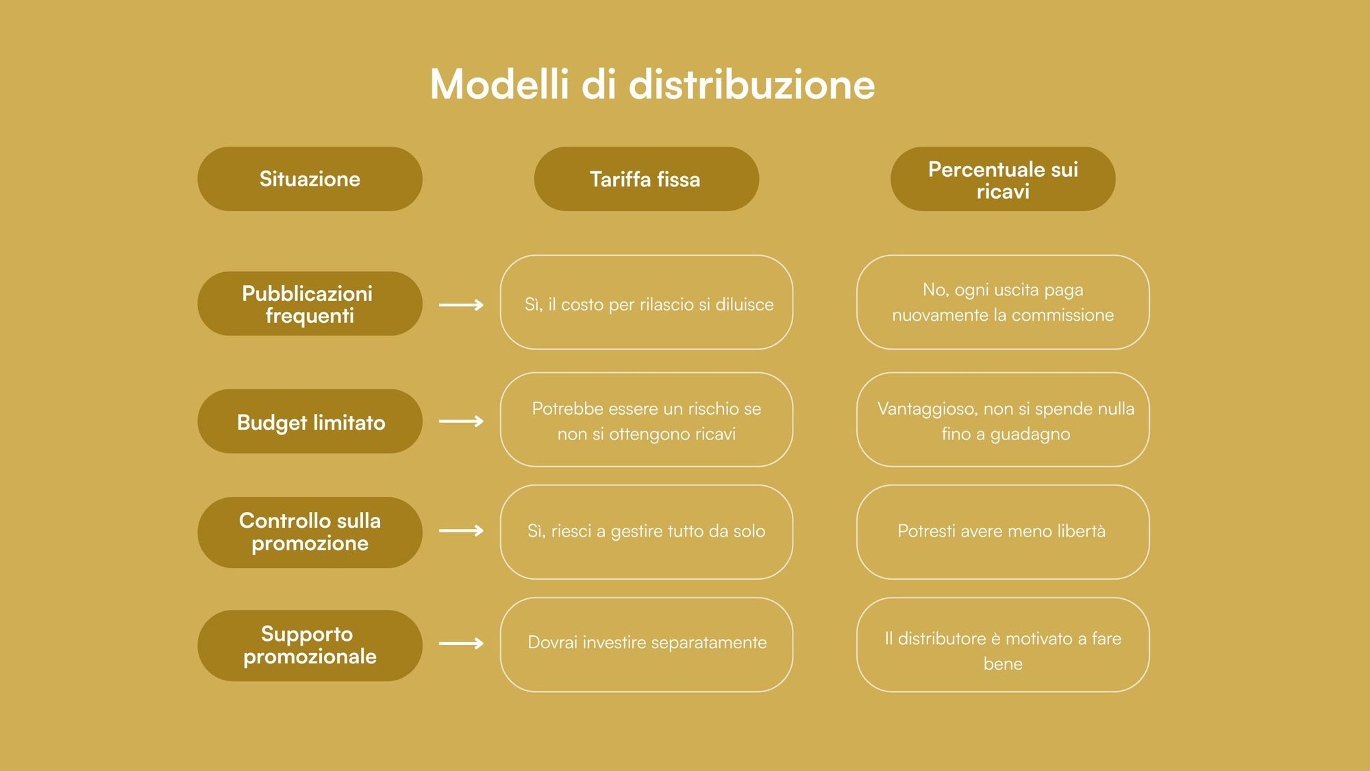 Alcuni distributori propongono un modello ibrido: paghi una piccola tariffa iniziale più una percentuale ridotta sui ricavi. In questo modo ottieni un misto tra previsione e collaborazione.
