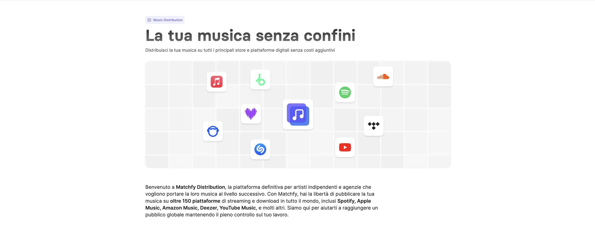 Matchfy consente agli artisti di distribuire i propri brani su tutte le principali piattaforme senza costi aggiuntivi di distribuzione. Si presenta come una soluzione integrata che permette di gestire sia la pubblicazione sia la promozione in un solo posto.