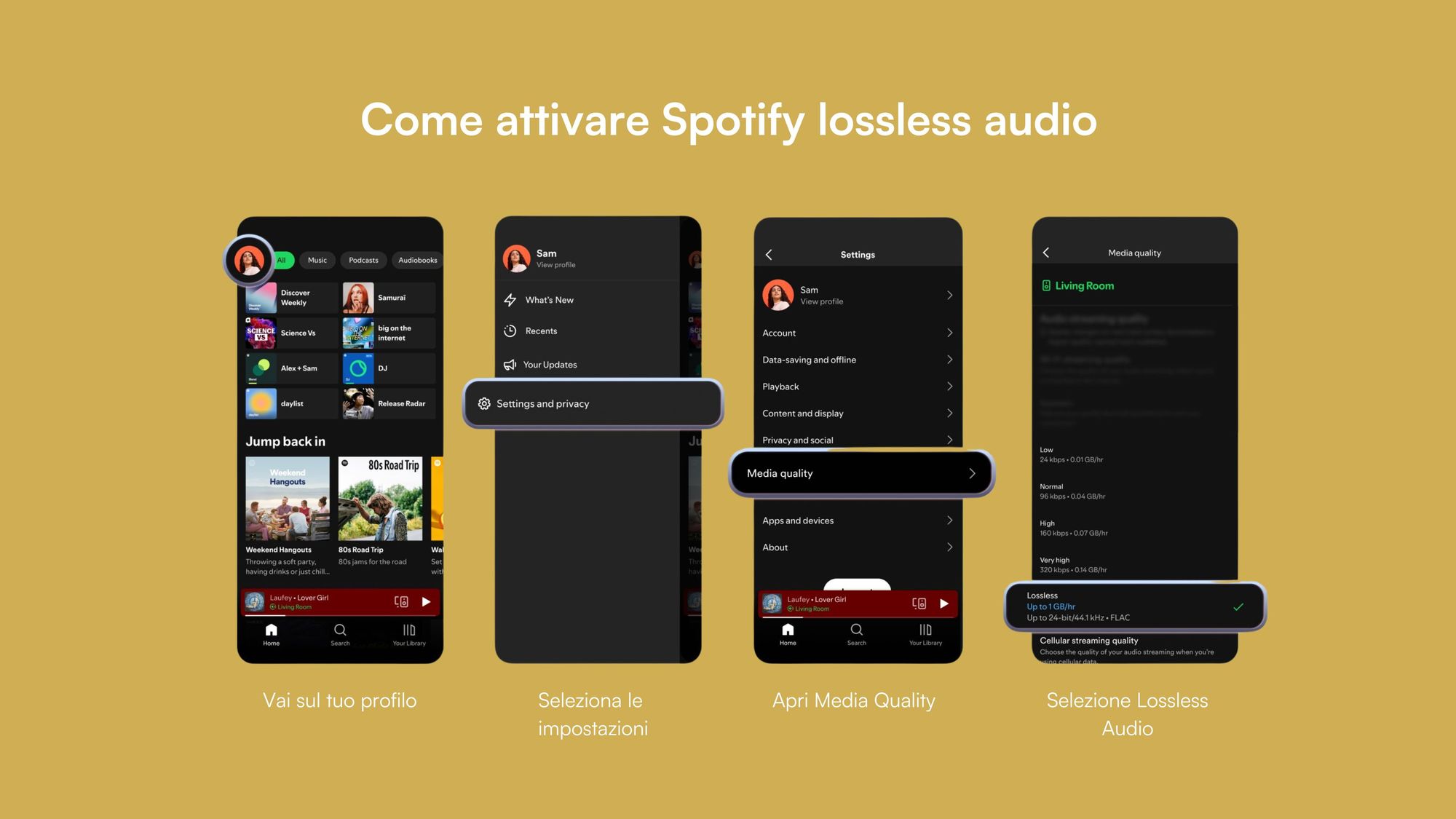 - Da mobile: vai su Profilo → Impostazioni e privacy → Qualità audio e seleziona “Lossless” per Wi-Fi, dati mobili o download.